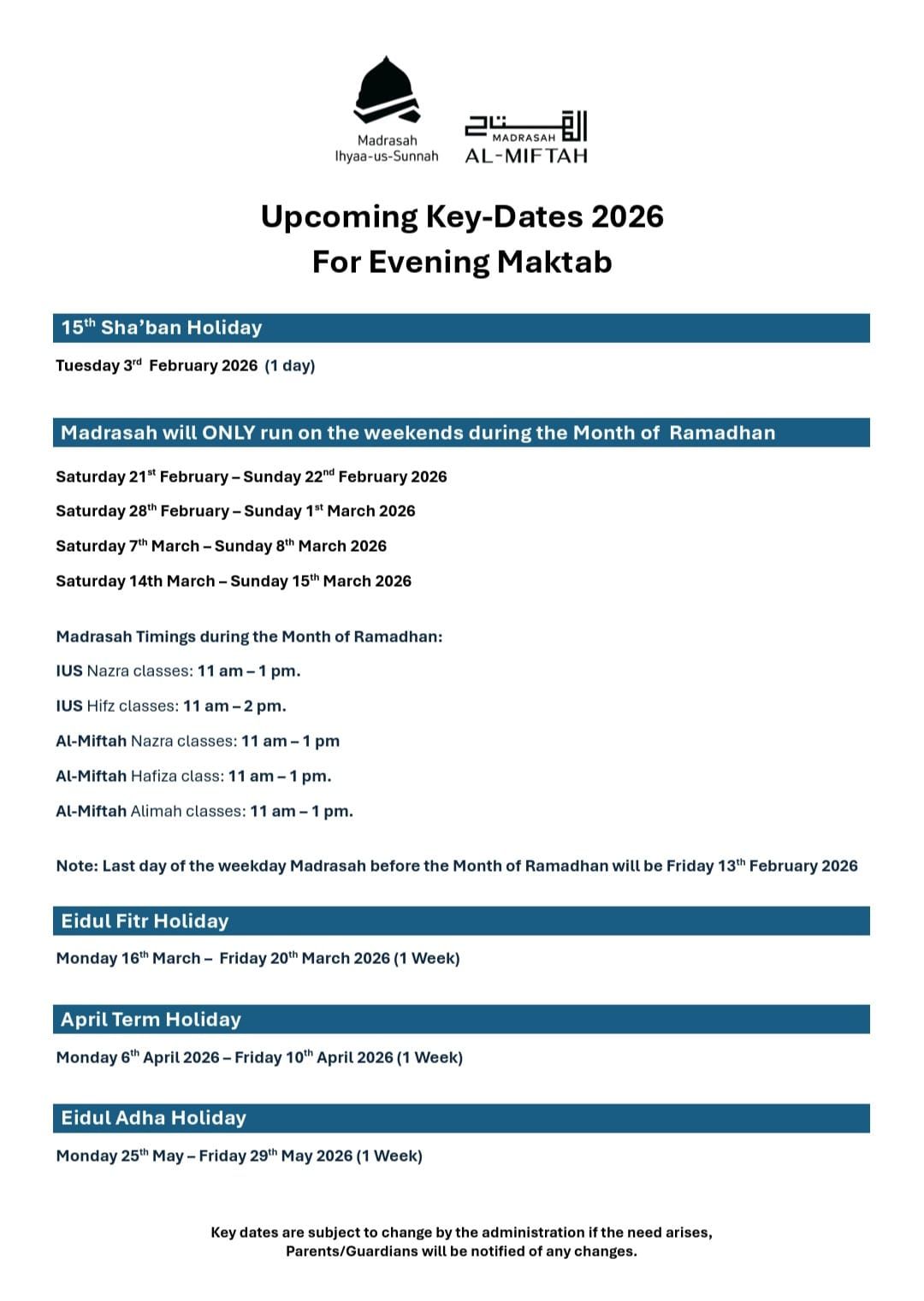 Note: Madrasah will resume on Wednesday 2026 (1 day holiday).